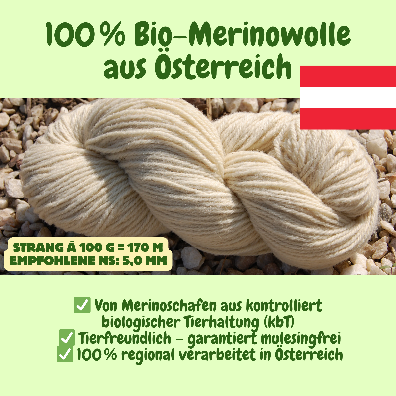 Freuen Sie sich auf meine brandneue Bio-Merinowolle Nature, exklusiv von österreichischen Merino-Schafen aus kontrolliert biologischer Tierhaltung (kbT). Dieses Produkt ist durch und durch regional – von der Gewinnung der Bio-Rohwolle bis zu den Verarbeitungsschritten wie Wollwäsche, Verspinnung und Aufmachung, die alle in Österreich durchgeführt werden. Erhältlich exklusiv bei strick-mir-was.at und unter meiner Eigenmarke BIOWOL.