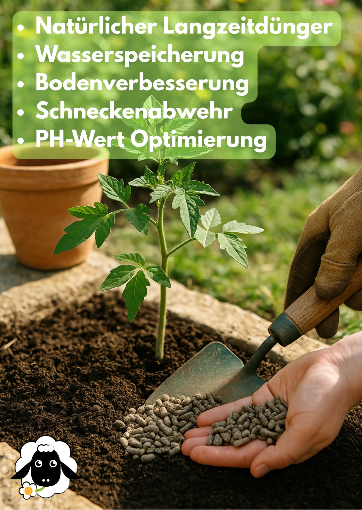 Rein Natürlich: Meine Bio-Düngerpellets bestehen zu 100% aus österreichischer Bio-Schafschurwolle von gesunden, lebenden Schafen aus kontrolliert biologischer Tierhaltung (kbT). Sie sind frei von Fremdzusätzen und Chemikalien, perfekt für umweltbewusstes Gärtnern.