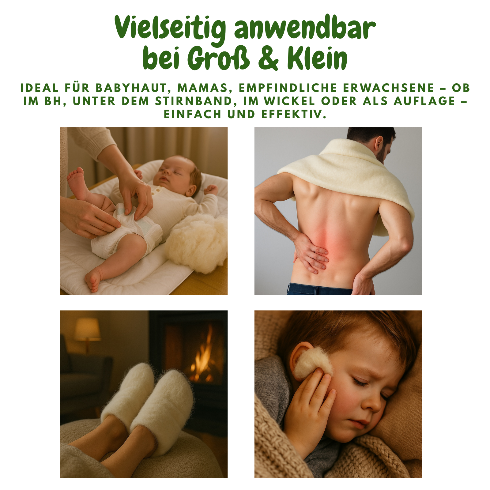 Vielseitige Anwendung: Meine Bio-Heilwolle ist ein traditionelles Hausmittel gegen eine Vielzahl von Beschwerden. Sie wirkt entzündungshemmend und durchblutungsfördernd und kann bei Hautirritationen, Windeldermatitis, wunden Brustwarzen, Ohrenschmerzen, Halsschmerzen, Husten sowie Gelenkschmerzen helfen.